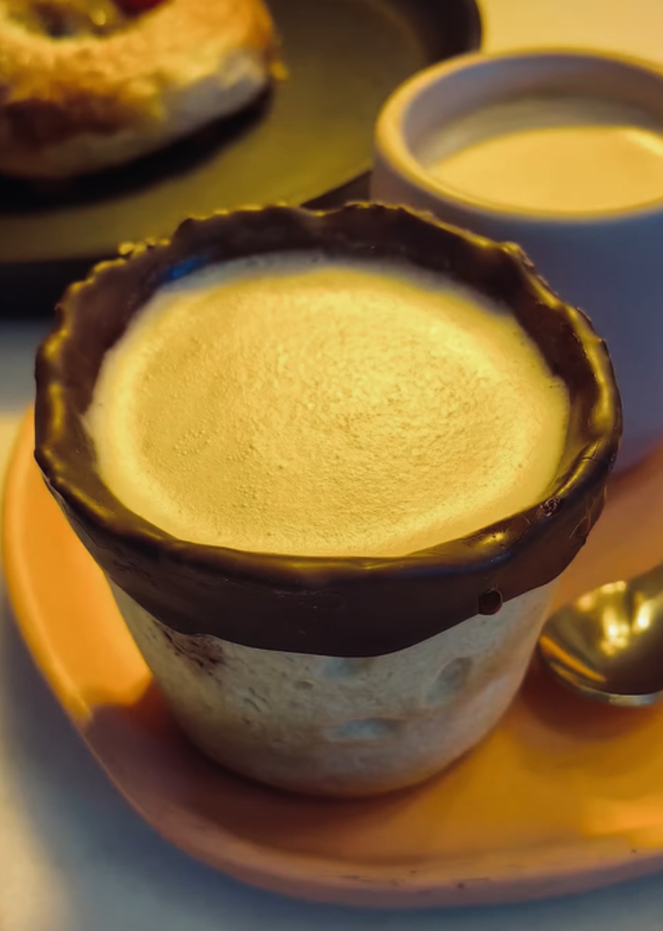 CAFÉ CAPUCHINO O LATTE SERVIDO EN DELICIOSA TAZA COMESTIBLE DE GALLETA CUBIERTA CON CHOCOLATE.